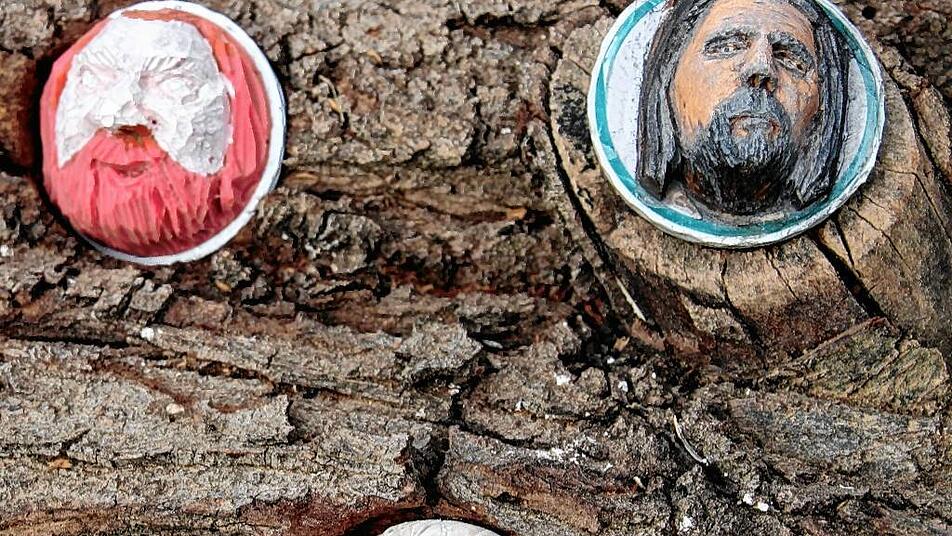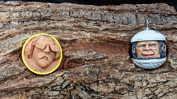 Vor einigen Jahren ist David Schneeberger auf die Idee gekommen. Bei seinen Spaziergängen rund um den Kitzinger Golfplatz hat er immer wieder herrenlose Bälle gefunden und mit nach Hause genommen. In seiner Werkstatt im Garten hat er die Bälle aufgeschnitten und gemerkt: Mit viel Fantasie und Finesse lässt sich daraus etwas machen. Also hat er die Bälle aufgebrochen und Gesichter in die galertartige Masse geschnitzt: Fantasiefiguren, Totenköpfe aber auch Nachbildungen von bekannten Musikern oder anderen Persönlichkeiten des öffentlichen Lebens. In Eierschachteln hat er einige Exemplare deponiert. Ein langhaariger Hippie liegt neben einem „Arsch mit Ohren“. An einem Nagel in der Wand hängt der Weihnachtsmann – mit roter Mütze und weißem Bart.