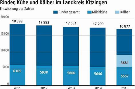 Das Rind ist die wichtigste Einkommensquelle für die deutsche Landwirtschaft: 12,6 Millionen Milchkühe, Mastrinder, Zuchttiere, Mutterkühe oder Kälbchen stehen momentan in den Ställen und auf der Weide von Berchtesgaden bis Flensburg. Im Kreis Kitzingen geht die Rinderhaltung jedoch zurück: aktuell werden 16 877 Tiere gehalten, 1522 weniger als noch vier Jahre zuvor.