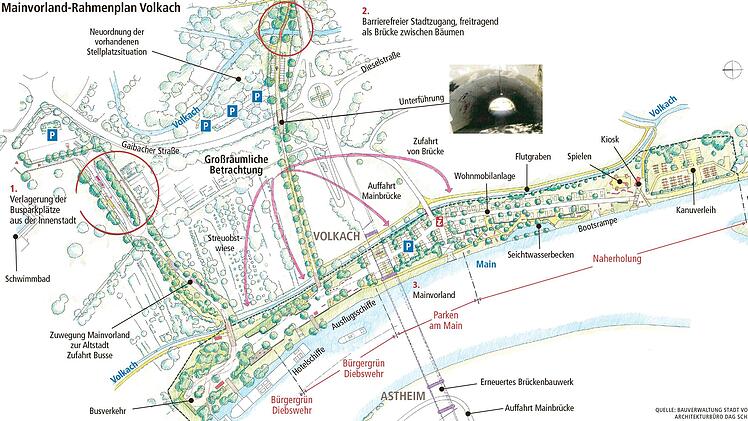 Herzstück für die Volkacher könnte das "Bürgergrün am Diebswehr" werden. "Eine Art Parkanlage" nannte es Kornell in der Sitzung. Die Idee Schäffners: Die bereits vorhandene Landschaft und die aufgelassenen Schrebergärten erhalten und von dort einen harmonischen Übergang zu den befestigten Flächen schaffen. Diesen Aufenthaltsbereich beschrieb Schäffner den Stadträten als "eine Art Platte, wie ein Schiffsdeck", aus dem man dann Grünflächen herausschneide. Dort könnten Nischen zum Sitzen, Abstellflächen für Fahrräder oder ein erhöhtes Holzdeck "für den abendlichen Blick auf den Main" entstehen.