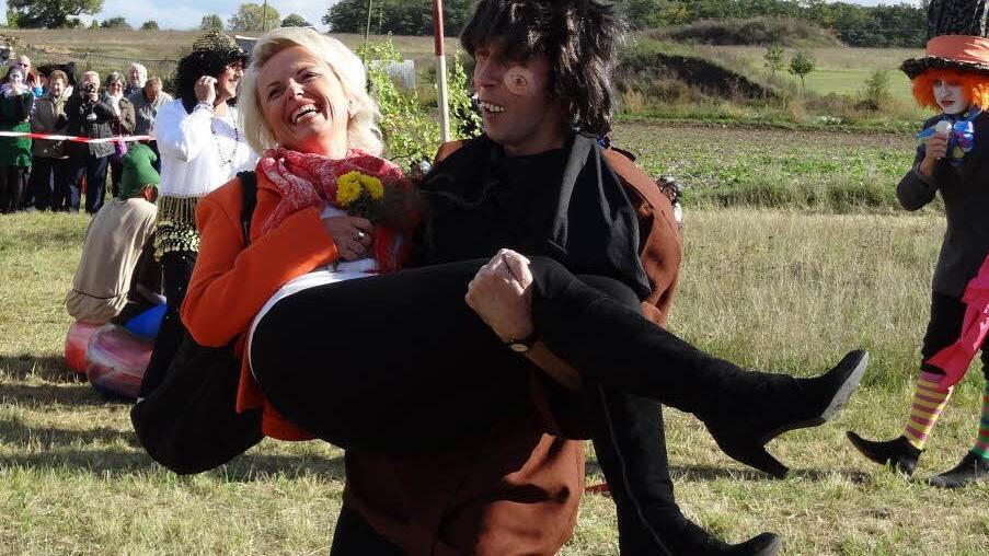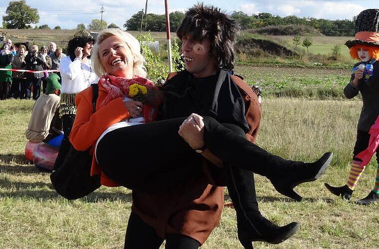 Lustige Szenen Begleitet von der Rödelseer Blaskapelle und dem farbenprächtigen Albertshöfer Spielmannszug ging's zum Ausgrabungsort. Dort liefen bei der Suche nach dem Kirchweihfass lustige Szenen ab: Hutmacher Andreas Böhm - aus Alice im Wunderland - führte durch ein humorvolles Programm, in dem die Geometer als Gummibären-Bande, der Glöckner von Notre Dame, der die Landrätin buchstäblich auf den Arm nahm, und Queen Elisabeth, welche der Burschenschaft die Nacktfotos ihres Enkels Prinz Harry abkaufen wollte, eine Rolle spielten.
