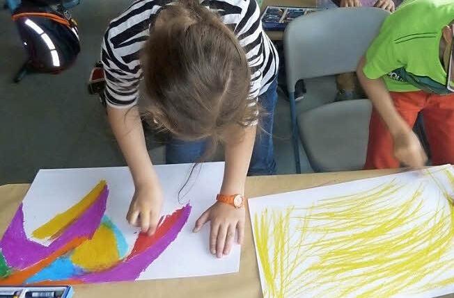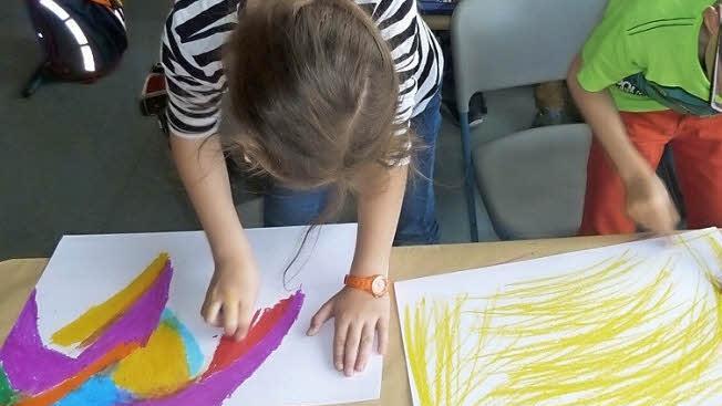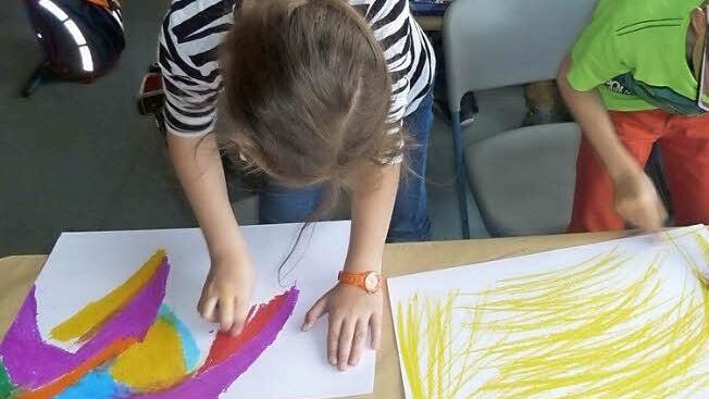 Doch bevor es losging, erfuhren die Kinder Wichtiges über die Ölkreiden, die Ursula Beck mit ihrem Begleiter Peter Schulze im Gepäck hatte. In der ersten Stunde hatten die Kinder alle Tische mit Packpapier abgeklebt. Allein das verlockte die Kinder schon zur künstlerischen Betätigung. Zur Eingewöhnung fand eine "lustige Malübung" statt, ein Mal-Diktat, bei dem alle mit geschlossenen Augen nach Anweisung Striche aneinander reihen mussten, in ihrer Lieblingsfarbe.