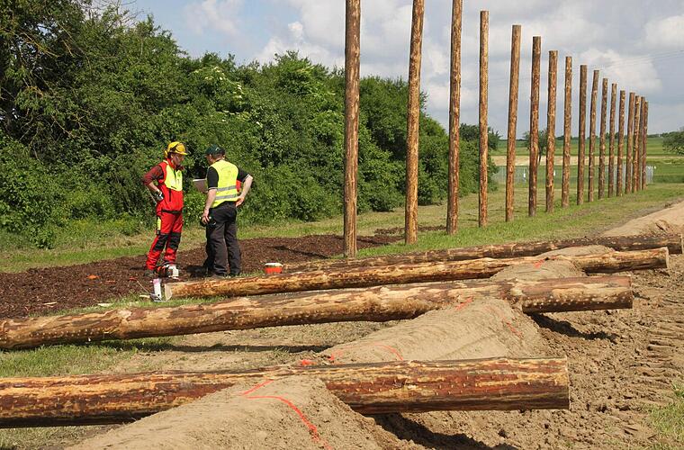 Wie die anderen trägt er Schutzkleidung in Rot und Neongelb. Die Forstwirte stechen hervor auf dem Gelände des Lehr-, Versuchs- und Fachzentrums. An Marios Jacke ist seine Teilnehmernummer befestigt - 23. Er macht sich für die nächste praktische Prüfung bereit: das Entasten. Er klappt sein Visier nach unten und reißt am Seilzug der Kettensäge. Der Motor rumpelt. Vor ihm liegt aufgebockt ein Stamm, aus dem 30 Äste ragen. Nach oben, rechts und links. Wenn Mario mit dem Holzstück fertig ist, soll der Stamm frei von Ästen sein. Bündig muss er sie abtrennen, sonst gibt es Punktabzug. Nicht einmal fünf Millimeter dürfen überstehen. Außerdem darf das Holz nicht eingeschnitten sein. "Es kommt auch auf die richtige Schnittfolge und die Methode an", erklärt Hartmut Otto.