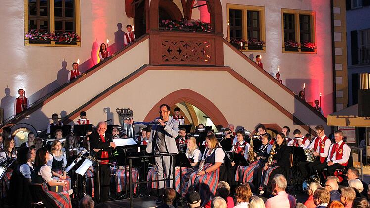 Das Symphonischen Blasorchester Volkach unter der Leitung von Professor Ernst Oestreicher lud auch in diesem Jahr laut einer Pressemitteilung wieder zur traditionellen Serenade am Pfingstsonntag auf den Volkacher Marktplatz ein.