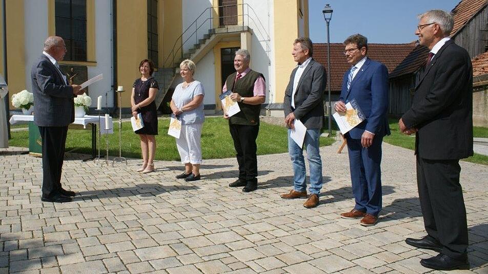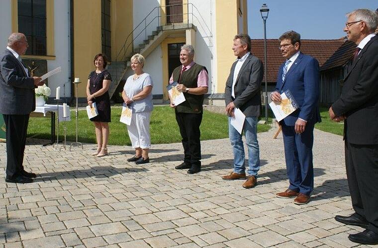 Seit 40 Jahren blasen Ines Bachner, Michael Dötsch und Andrea Köhler im Posaunenchor Rüdenhausen zur Ehre Gottes, Erich Ackermann und Gerhard Ackermann sind sogar schon seit 50 Jahren in der Kirchenmusik aktiv. Im Festgottesdienst auf dem Rüdenhäuser Kirchplatz wurden sie im Namen des Posaunenchorverbandes von Pfarrer Erich Eyßelein geehrt: „Die Gemeinde braucht Euer Blasen, diese besondere Art der Verkündigung! Was Worte nicht schaffen, gelingt der Musik. Ja, Ihr tragt dazu bei, dass fröhliche und von Sorgen belastete Zuhörer sich auf wunderbare Weise durch Euer Musizieren angesprochen und angenommen fühlen und beginnen, neu Glauben und Vertrauen zu schöpfen“, so Pfarrer Eyßelein in seiner Laudatio. Pfarrer Martin Fromm überreichte für die Kirchengemeinde Rüdenhausen jedem der Ausgezeichneten ein Buchgeschenk. Die hervorragende musikalische Gestaltung des Festgottesdienstes durch den Posaunenchor unter Leitung von Reiner Bachner, die die Gottesdienstbesucher nach dem Schlussstück mit reichem Applaus bedachten, machte einmal mehr deutlich, wie reich die Bläser die Gemeinde mit ihrem Dienst beschenken.