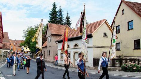 Zahlreiche Chöre der Sängergruppe Kitzingen beteiligten sich am Umzug, der sich durch die Straßen von Rüdenhausen schlängelte – angeführt von den Fahnen der örtlichen Vereine und natürlich des Jubilares, des Singvereins Rüdenhausen.