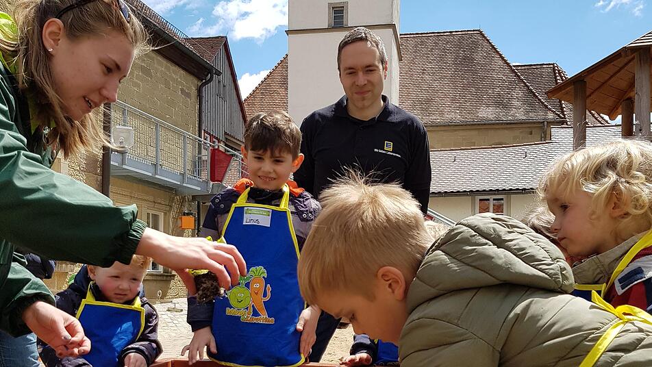 Essen, was man selbst gegärtnert hat – das können seit einem Jahr die Mädchen und Jungen beim Kindergarten Sonnenschein in Nenzenheim, die von der Edeka-Stiftung im Zuge des Ernährungsprojekts "Gemüsebeete für Kids" ein Hochbeet zum selbst bepflanzen und pflegen erhielten. Einzelhändler und Pate Jochen Waigandt brachte jetzt laut Pressemitteilung mit den Stiftungs-Mitarbeitern Evelin Gayer und Manuel Niedling frische Erde und neue Pflanzen mit und zeigte den Kindern, wie man das neue Beet anlegt. „Schon im Kindergartenalter sollen die Kleinen lernen, dass das Gemüse nicht einfach so in die Supermarktregale kommt, sondern wie man es hegt und pflegt“, so Waigandt, selbst Nenzenheimer Kindergartenpapa und Marktleiter. Zum Beet und zu den Pflanzen gab es dann noch Gärtnerschürzen und Urkunden dazu.