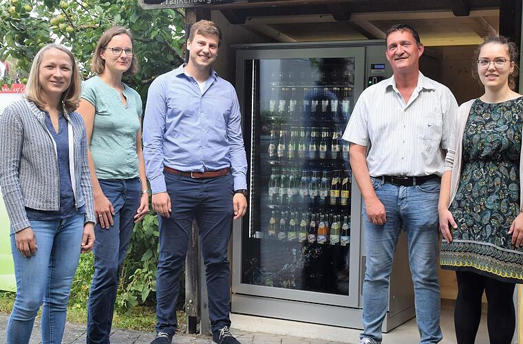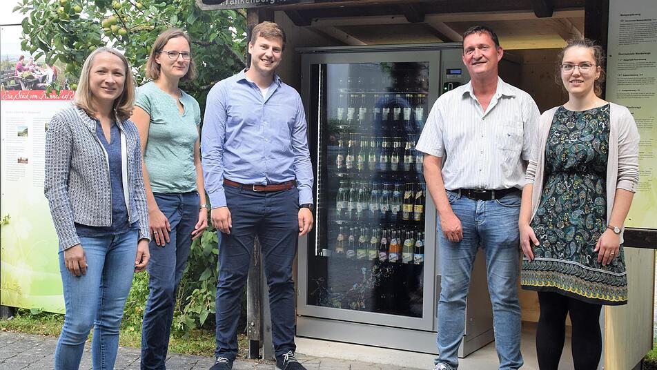 Die Managerinnen und Manager der Allianzen zogen nun an der Weinparadiesscheune eine erste Bilanz. Dort an der Scheune, dem Aushängeschild des Weinparadieses Franken auf der Grenze der Landkreise Kitzingen und Neustadt/Aisch Bad Windsheim, hatte Pächter Helmut Scherer mit Förderung durch das Regionalbudget einen Getränkeautomaten aufstellen lassen, bei dem sich Wanderer im Weinparadies auch außerhalb der Öffnungszeiten der Scheune mit kühlen Getränken versorgen können. Neben Alkoholfreiem gibt es auch Bier und Wein gegen Altersnachweis. Derzeit ist der Automat nur mit Silvaner bestückt, doch laut Scherer werden es bald auch Riesling, Bacchus, Rotling und ein Secco sein.