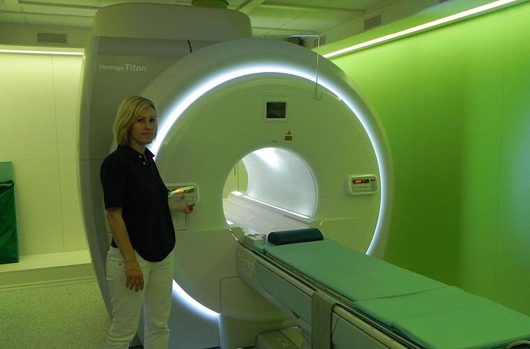 Manche Patienten scheuen "die Röhre". Aber in diesem neuen Gerät der Marke Toshiba hat die runde Öffnung einen großzügigen Durchmesser von 71 Zentimeter, zudem ist sie nach hinten hin offen. Der MRT ist in einem Raum mit apfelgrünen Wänden und sich veränderndem bunten Licht aufgestellt. Der Raum strahlt so eine Atmosphäre von Weite und Frische aus.