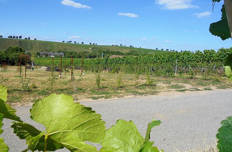 Die Freifläche der Kita ist auf der Ostseite des Grundstücks angeordnet. Ein acht Meter breiter Grünstreifen mit einer dichten Bepflanzung aus Stauden und Sträuchern an der östlichen Grundstückgrenze trennt den Freibereich der Kinder von den landwirtschaftlich genutzten Weinbergen.