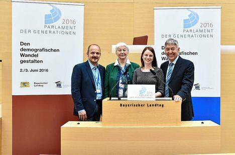 „Mitzuerleben, wie im Landtag das Ringen um den richtigen Weg abläuft und Ideen verhandelt und durchgesetzt werden, war spannend“, wird die Nachwuchspolitikerin Sabrina Stemplowsky (Zweite von rechts) in einer Pressemeldung zitiert. Auf Einladung des Bayerischen Landtags und der Akademie für Politische Bildung in Tutzingen nahm die Kitzingerin am Parlament der Generationen im Münchner Landtag teil. Als „Starterin“ vertrat sie dabei die junge Generation. In der Gruppe der „Macher“ (31 bis 50) begleitete sie der Bürgermeister von Prichsenstadt, René Schlehr (links), und für die „Kenner“ (ab 67) die Kitzingerin Silvia von Krziwanek. Bei dem Planspiel rangen die verschiedenen Altersklassen in zwei Gruppen um den richtigen Weg, der am Ende positiv ausfiel: „Es kann gelingen, eine nachhaltige Politik zu gestalten, die folgende Generationen nicht zu sehr belastet“, so Stemplowsky. Zum Abschluss gab es ein gemeinsames Essen mit Otto Hünnerkopf, Stimmkreisabgeordneter des Kreises Kitzingen (rechts). 1#googleAds#100x100