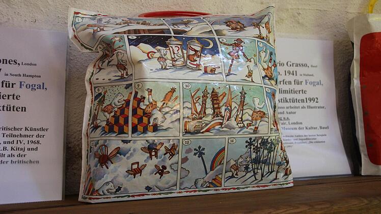Zu sehen sind 150 Tüten aus der privaten Sammlung. Normalerweise bewahrt er die in einem großen Schrank auf. Einige von ihnen sind auch gerahmt und hängen bei ihm zuhause.