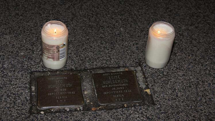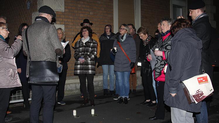 Rund 20 Bürger waren der Einladung der CSU-Ortsgruppe gefolgt. Vom neuen Koffer-Denkmal am Rosengarten aus zogen sie zunächst ins Mühlberggebiet und dann weiter zum Hindenburg-Ring und in die Landwehrstraße. Zahlreiche "Stolpersteine" erinnern daran, dass hier einstmals viele jüdische Familien lebten. Als Zeichen des Gedenkens stellten die Teilnehmer vor den ehemaligen Wohnhäusern der ermordeten Bürger Kerzen auf und gedachten ihrer in einem kurzen Moment der Stille. Auch ihre Namen wurden vorgelesen, wann sie geboren wurden und wann sie in die Vernichtungslager deportiert wurden.