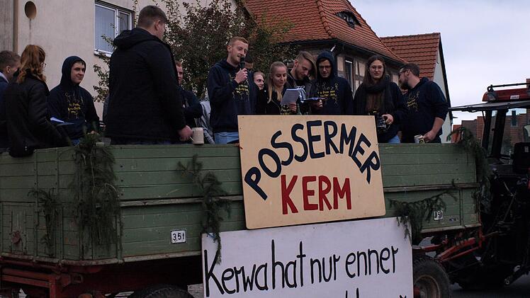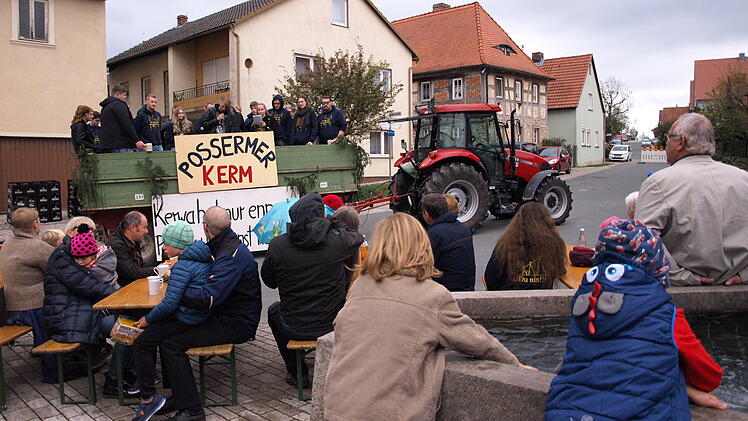 Gezogen von einem Traktor, fuhr am Sonntagnachmittag der "Kracken-Express" der "Possermer Jugend" zur Kirchweih in Possenheim in die Dorfmitte, um die alljährliche Kirchweihpredigt zu verlesen. Wie es die Tradition will, dargeboten von gleich mehreren Predigern, die das Geschehen der vergangenen Monate launig in Reimform Revue passieren ließen. Und – zu aller Überraschung –Grüße aus Neuseeland mitbrachten.