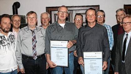 Für 25-jährige Betriebszugehörigkeit ehrte Rank Norbert Hackstein. Ebenfalls 25 Jahre im Betrieb ist Harald Hermann. Zehn Jahre im Betrieb sind Theophil Ptok, Martin Kögler, Winfried Kernwein und Rainer Grötsch. Sie sind alle vor zehn Jahren von der Sulzfelder Baufirma Schenkel zu Rank gekommen.