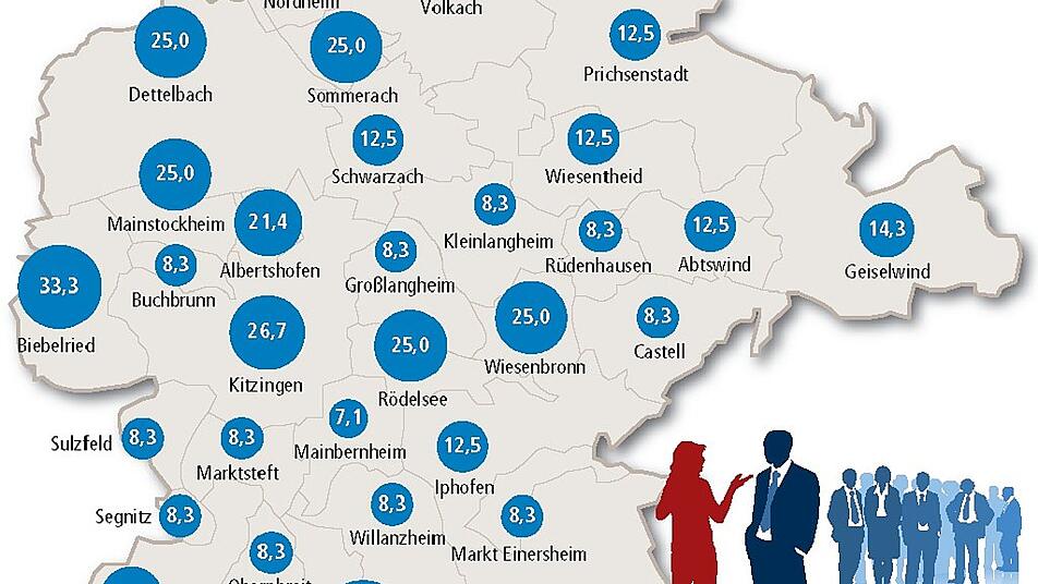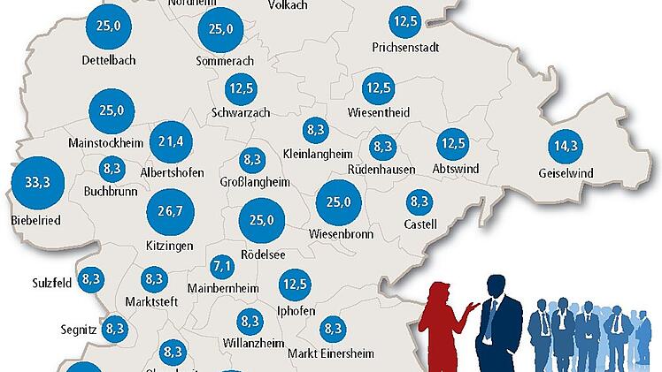 Ähnlich sieht es Roland Hoh, Bürgermeister von Biebelried. Mit einer Quote von 33,3 Prozent belegt die Gemeinde den zweiten Platz. Vier Frauen stehen acht Männern gegenüber. „Die Mischung macht's“, sagt Hoh. Gerade bei planerischen Entscheidungen hätten die Damen das bessere Gefühl. An dritter Stelle kommt der Kitzinger Stadtrat. Von den 30 Plätzen sind acht von Frauen besetzt (26,7 Prozent).