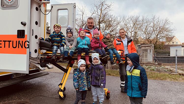 Bei Projekttagen erhielt der Kindergarten Eichfeld Besuch vom Rettungswagen des Roten Kreuzes aus Volkach.