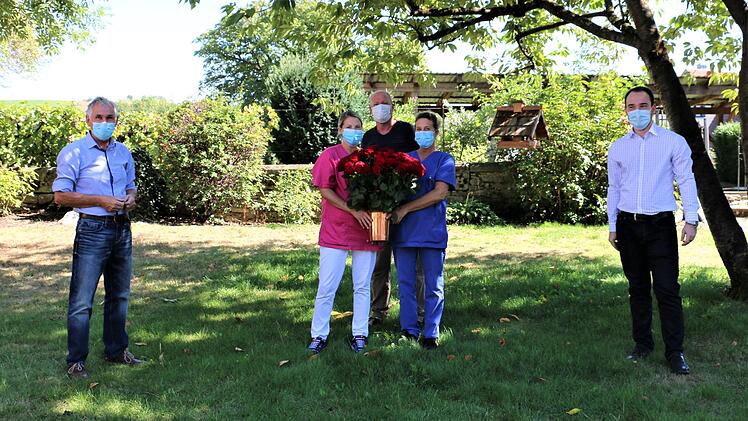 Jährlich verteilt die Mainstockheimer SPD rote Rosen an die Mütter von Erstklässlern. Angesichts der verschärften Hygiene-Regeln war dies heuer nicht möglich, wie die SPD mitteilt. Die Rosen gingen daher an das Personal des Seniorenheims Schloss Ebracher Hof, die "stillen Helden" in der Corona-Krise. Othmar Röhner  und Maurice Then vom SPD-Ortsverein übergaben die Rosen stellvertretend an Nadine Beck (Altenpflege- und Gerontofachkraft), Geschäftsführer Peter Brandner und Altenpflege-Assistentin Dana Schlereth.
