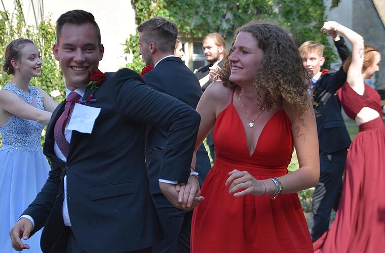 Als die Tanzpaare nach dem Umzug wieder zurück in den Schlossgarten kamen, schien es vielen Betrachtern, als reichte das Orientierungsvermögen der Burschen gerade noch aus, um dem Barthel-Träger zu folgen. Trotzdem ließen sie mit einem weiteren Glas Wein das Fürstenhaus hoch leben und führten anschließend die festlich gekleideten Tanzpartnerinnen souverän zum Diskofox.