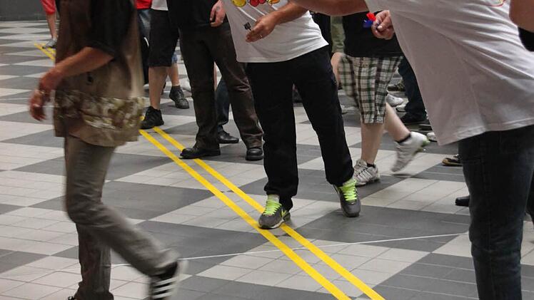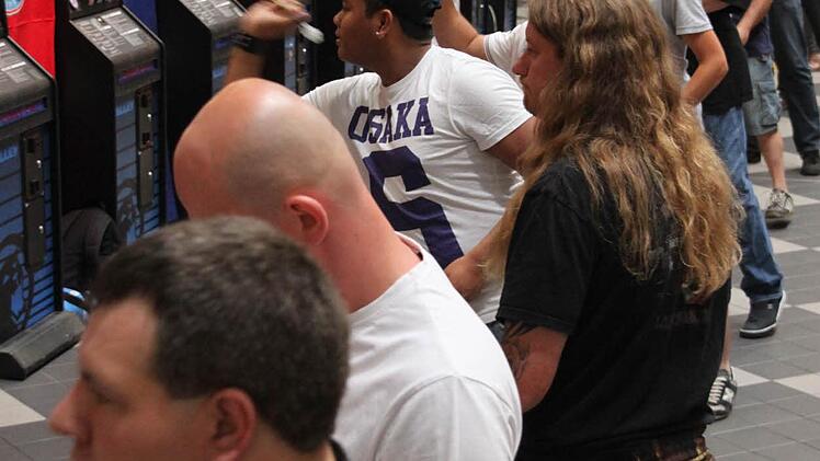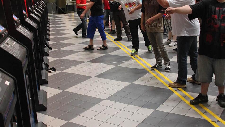 Sascha Stein wird mit seinem Team aufgerufen. Die Gruppe steuert einen Dartautomaten in der Mitte der Halle an. Um sie herum ballern die Spieler ohne Pause in die blauen und roten Felder der Dartscheibe.