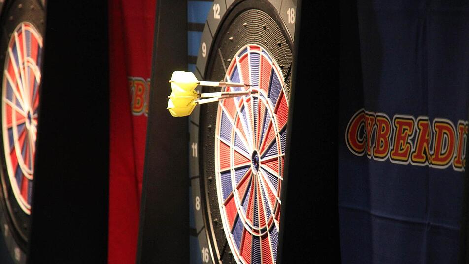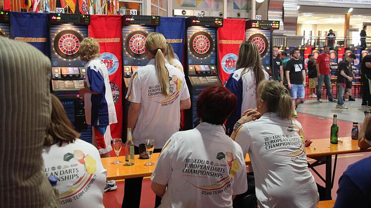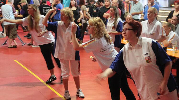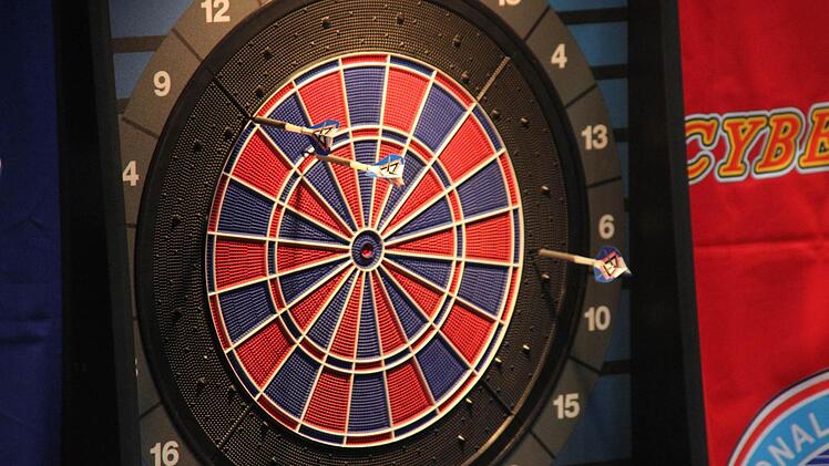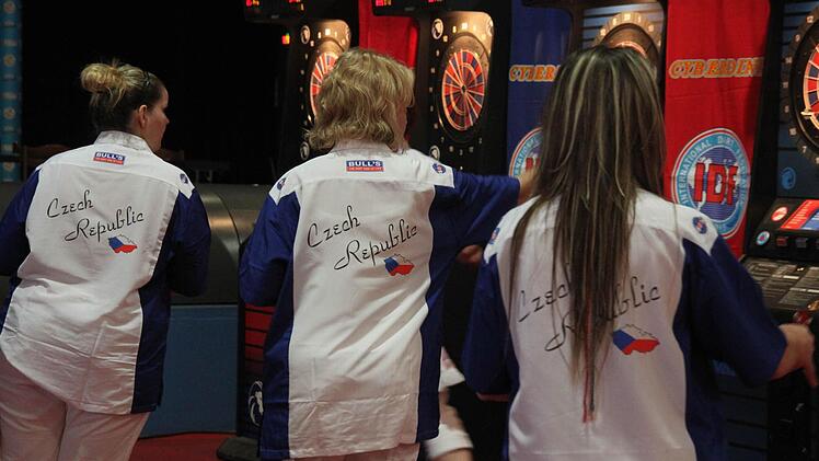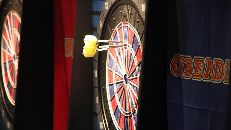 Einen Schiedsrichter gibt es nicht: "Das macht der Automat." Sascha Stein greift nach seinen Dartpfeilen. Drei Stück liegen in der Brusttasche seines weißen Poloshirts bereit. Jeder in einer anderen Farbe: Schwarz, Rot und Gold. 18 Gramm wiegen die Pfeile. "Leichter dürfen sie sein, schwerer nicht", erklärt Stefan Reichert. Sascha Stein tritt an die gelbe Linie und bringt sich in Position. Er fixiert das Zielfeld und feuert auf die Scheibe. Wie das Spiel ausgeht, entscheiden auch seine Mitstreiter. Die deutschen Damen haben es schon bis ins Endspiel geschafft.