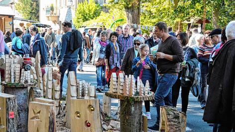 Vielen konnten die Besucher über die Schulter schauen. Zum Beispiel dem Kettensägekünstler, dem Besenbinder oder dem Strohnapfhersteller, aber auch beim Flechten von Weidenkörben, beim Schnitzen oder beim Fackelziehen waren Zuschauer immer willkommen. Im Hof neben den Hallen spielten die Alphornbläser „Schwarze Berge“ und die Künstlerin Caroline Keufen erfreute auf ihren hohen Stelzen nicht nur die Kinder.