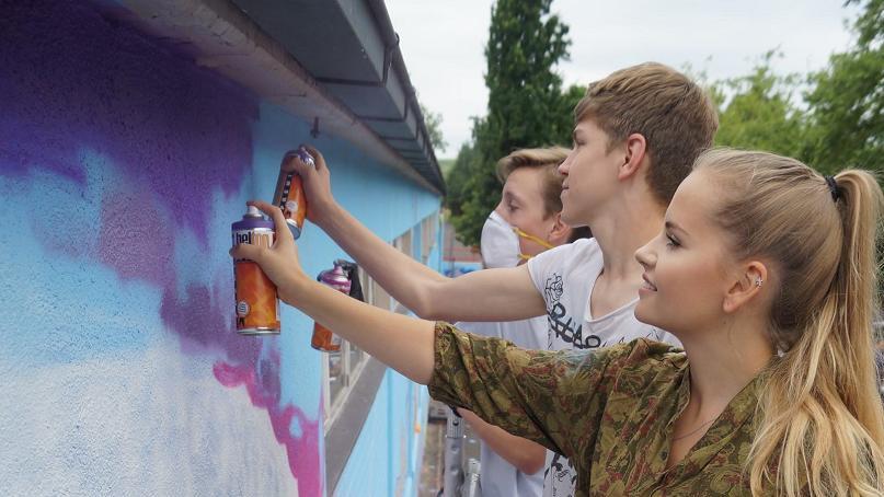 Damit die Schüler in Ruhe arbeiten konnten, galt für die Parkplätze vor der Wand ein absolutes Halteverbot. Über einige Wochen pinselten und sprühten die Jugendlichen die Meerestiere an die Wand, versahen ihr Werk auch mit dem bunten Schriftzug „Freibad“ und ließen das gesamte Kunstwerk von einer Welle „anspülen“.
