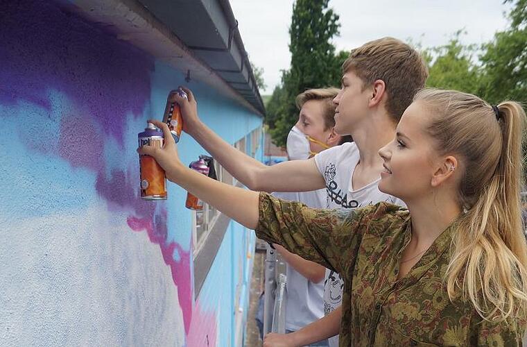 Bunt, bunter, Volkacher Freibad: Kraken, Seepferdchen, Meeresschildkröten, Wale und sehr viele Schwärme von Fischen verzieren nun eine Außenwand des Freibades. Dort durften sich Kunstschüler der elften Klassen des Franken-Landschulheimes Schloss Gaibach austoben. Genauer gesagt handelt es sich um zwei P-Seminare im Fach Kunst, das P steht für Projekt. Unter der Anleitung der Kunstlehrerinnen Julia Göck und Stefanie Neff entstanden allerhand Kunstwerke.