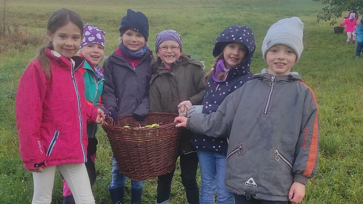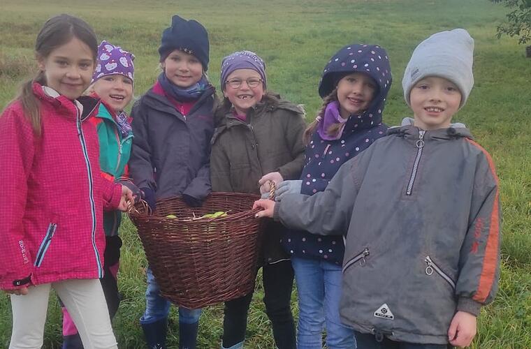 In diesem Herbst nahmen die Erstklässler der Grundschule Willanzheim zusammen mit ihrer Lehrerin an einer Aktion des Kirchenburgmuseums teil. Angekommen in Mönchsondheim wurden alle Kinder mit Utensilien, wie Schubkarre und Körben ausgestattet, um auf einer Streuobstwiese Äpfel zu sammeln. Alle packten unter Anleitung von Frau Dorsch mit an, sodass im Nu alle Säcke prall gefüllt waren. Zurück im Museum musste das gepflückte Obst erst einmal gewaschen werden, um anschließend in der Mühle zu Maische verarbeitet werden zu können. Ihre Kräfte mussten anschließend die Schulanfänger noch bei der Apfelpresse unter Beweis stellen. Doch es dauerte nicht lange, bis der frischgepresste Apfelsaft in den Eimer tropfte, der sofort genüsslich probiert wurde. Zum Abschluss durfte jedes Kind noch eine Flasche des selbst gekelterten Apfelsafts mit nach Hause nehmen. Bevor der Bus die Kinder wieder zurück in die Schule brachte, gewannen alle noch einen Blick in ein altes Klassenzimmer des Museums. Da freuten sich doch alle wieder auf ihre neue Schule in Willanzheim.