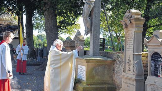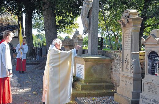 Besonders erwähnte Rössner den Grabstein von Pfarrer Michael Rauch, der 1884 nach 47 Priesterjahren in Euerfeld starb. Das neoklassizistische Werk zeigt einen Kelch als Zeichen für die Eucharistie, ein Brevier, also das Gebetbuch des Priesters, und das Biret, die früher übliche Kopfbedeckung für Geistliche.