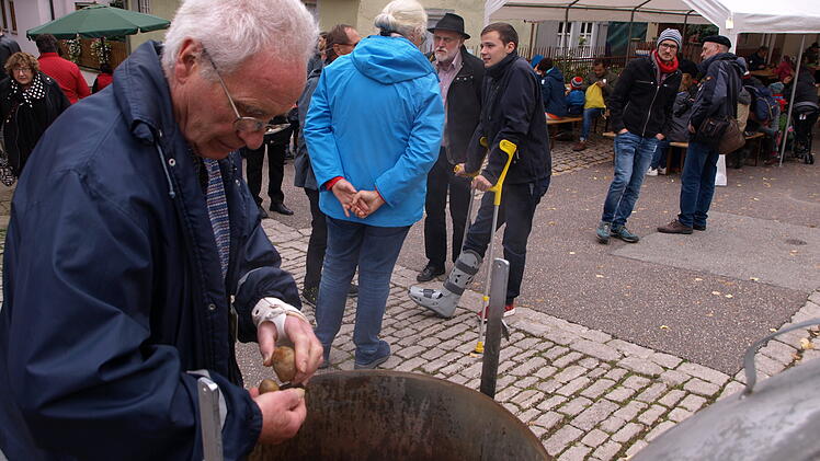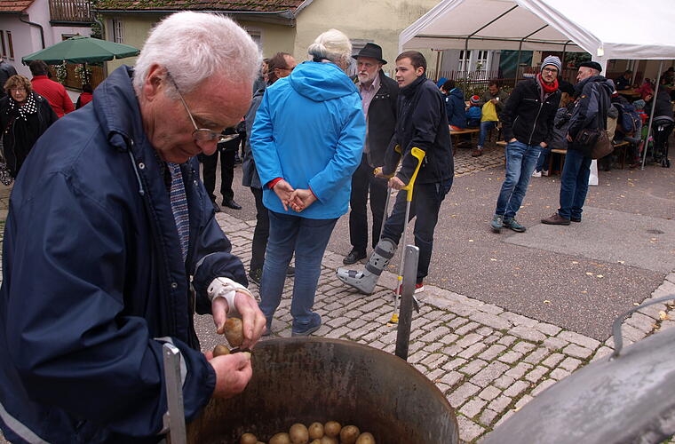 Ebenso wie die Erfahrung, dass Krautwurst mit Kartoffeln durchaus eine leckere Alternative zur klassischen Bratwurst im Brötchen sein kann. Die gab es zwar auch, dazu aber frische Kartoffeln, direkt aus dem Kessel, die von den meisten Gästen gleich mit Schale verputzt wurden. Wer es fleischlos bevorzugte, ließ sich eine Schöpfkelle von frischem Quark auf den Teller geben. Wer es süßer mag, reihte sich in die zur Mittagszeit recht lange Warteschlange ein und freute sich auf "Apfelkräpfli mit Vanillsoß".