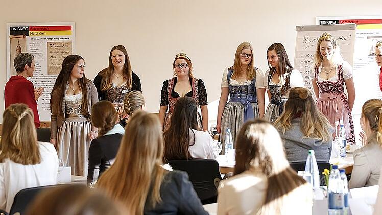 Und zu üben gab es viel. Wie etwa reagiert eine 17-jährige Schülerin am smartesten, wenn ihr plötzlich ein Mikrofon unter die Nase gehalten und knifflige Fragen gestellt werden? Ob der fränkische Rotwein denn überhaupt mithalten könne mit denen aus dem Süden? Ob sie einen Freund habe? Und wozu braucht es überhaupt so viele Weinprinzessinnen? Bei der letzten Frage gibt Referentin Nicole Then-Plannasch den 31 Teilnehmerinnen eine klare Antwort: „Es gibt viele Produkt-Königinnen, aber die Weinprinzessin hat einen besonderen Stellenwert in der Wahrnehmung.“ Seit über 60 Jahren gebe es Weinhoheiten. Damit sei es ein traditionelles Amt, ja, „aber Ihr seid kein Bild-Beiwerk für alte Männer“.