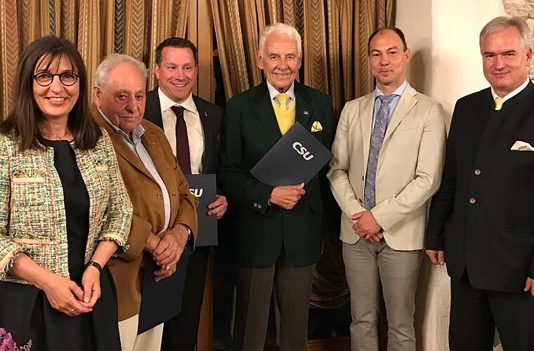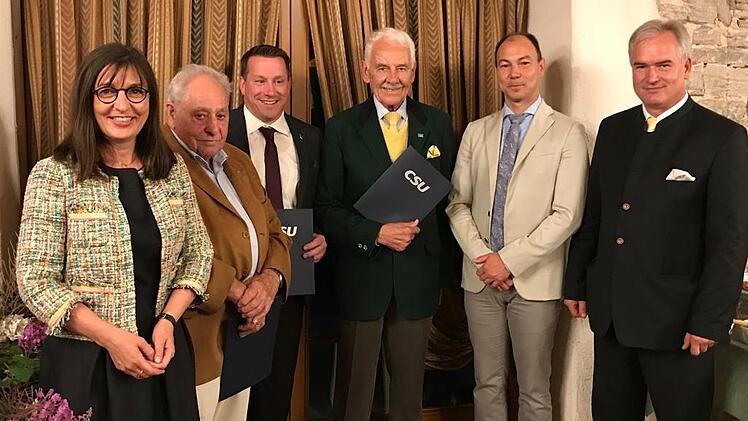 Der Höhepunkt im Jahreskalender des CSU-Ortsverbands Markt Einersheim ist, laut Pressemitteilung, immer das Sommerfest, zu dem seit Jahrzehnten Ehrenbürger Nikolaus Knauf und seine Gattin Ingrid Knauf in ihr Schloss-Anwesen einladen. Heuer stand Nikolaus Knauf nicht nur als Gastgeber im Mittelpunkt, sondern auch als Geehrter. Erstmals war Barbara Becker als Landtagsabgeordnete und CSU-Kreisvorsitzende zum Sommerfest gekommen und verlieh ihm eine Ehrenurkunde für 55 Jahre Parteitreue bei den Christsozialen. Seine Aufwartung machte auch der Kreisvorsitzende der Mittelstandunion und Bezirksvorstandsmitglied Tibor Brumme. Stellvertretender Kreisvorsitzender und Ortsverbandsvorsitzender Bent Hanel gratulierte auch den weiteren Geehrten Friedrich Ott (für 35 Jahre) und Gunter Meidel (für 25 Jahre). Im Bild (von links) Barbara Becker, Friedrich Ott, Gunter Meidel, Nikolaus Knauf, Tibor Brumme und Bent Hanel.