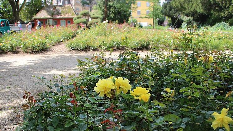 An diesem Tag haben sich um 13 Uhr auch noch drei Stadtgärtner eingefunden, die sich um die Blumen kümmern, die der Anlage ihren Namen geben. Ein späterer Anruf bei Günther Lorey in der Stadtgärtnerei bringt die überraschende Erkenntnis: Bis zu 800 Rosen zieren Kitzingens grüne Lunge. Wobei der Garten eher ein Park ist, wie die 40 Bäumen beweisen. Die Stadtgärtner kümmern sich hingebungsvoll um den Garten-Park. Alle zwei, drei Wochen wird nach dem Rechten geschaut und das Unkraut vertrieben.