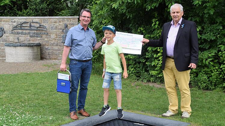 Rund 6000 Euro haben beide Geräte gekostet. Möglich wurde die Anschaffung durch eine Spende in eben dieser Höhe durch die Raiffeisenbank Kitzinger Land. Einen symbolischen Scheck erhielt Bürgermeister Burkhard Klein (links) aus den Händen des Bankvorstands Albrecht Hack, während der siebenjährige Lian Stadtel das Erdtrampolin ausgiebig testete.