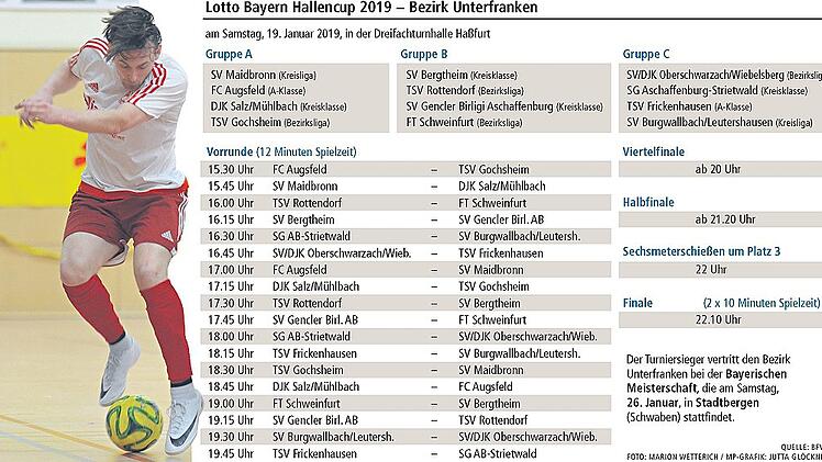 Wenn man sich bei den Teilnehmern der Hallenbezirksmeisterschaft aus den Spielkreisen Würzburg, Schweinfurt und Rhön umhört, favorisieren die meisten den TSV Rottendorf. Denn die Kicker aus dem Würzburger Vorort reisen nicht nur als Titelverteidiger nach Haßfurt, sondern haben auch in den vorherigen Turnieren auf Kreisebene Eindruck hinterlassen. Das gelang allerdings nicht nur den Rot-Schwarzen. Auch die Schweinfurter Bezirksligisten Gochsheim, FT Schweinfurt und Oberschwarzach/Wiebelsberg zählen zum Favoritenkreis.