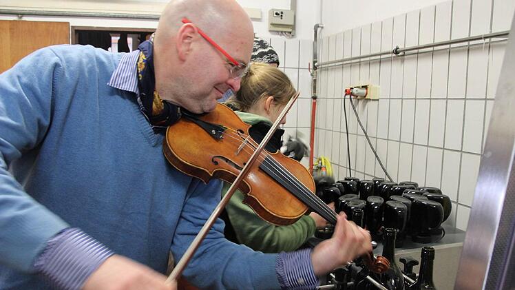 Florian Meierott spielt heute auf einer kleineren Bühne als sonst: Im Abfüllraum der Luckerts vom Zehnthof in Sulzfeld schwingt er den Bogen - für 2500 Liter Wein. Während der Silvaner aus dem Maustal in die glänzenden Bocksbeutel fließt, spielt er ihnen klassische Stücke vor.