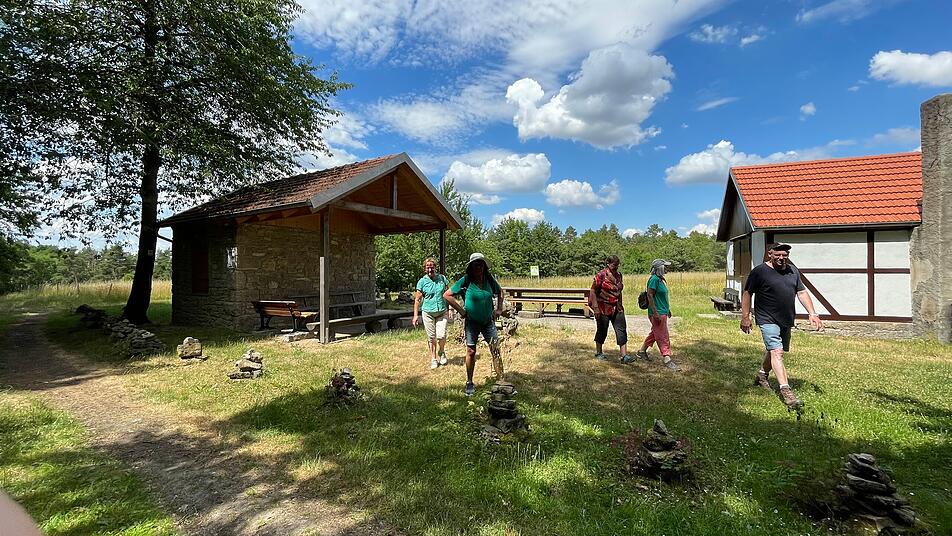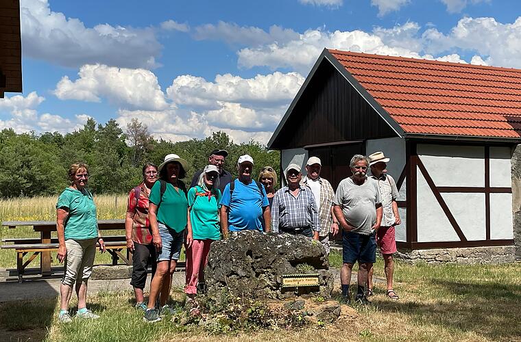 Nach der Einkehr im "Gasthaus zur grünen Linde" wurde der etwas kürzere Weg zurück nach Theilheim angetreten. Dieses Teilstück führt zu einem der aufgelassenen Steinbrüche. Sie sind untrennbar mit der mainfränkischen Kulturlandschaft verbunden. Der Wanderer wird an der ehemaligen Kantine der Steinbrucharbeiter darüber informiert. Das kleine Gebäude und die Schmiede wurden von engagierten Bürgern vor dem Abriss bewahrt. Der Steinbruch zeigt ein historisches Relikt, einen sogenannten Derrickkran, der zum Bewegen der großen Lasten benutzt wurde. Weiter ging es vorbei an der Lützelquelle über die Autobahn zurück nach Theilheim. Zwischendurch konnten wir uns mit den wilden Kirschen am Wegesrand einige Vitamine zur Stärkung pflücken. Mit bis zu 30°C war es doch sehr heiß, und so waren wir über jeden Schatten, der sich uns bot erfreut.