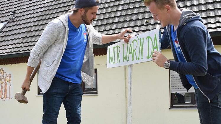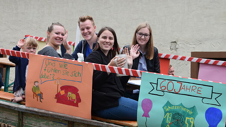 Vor dem Haus des Feuerwehrkommandanten pflockten die Kirchweihburschen deshalb ein Schild mit der Aufschrift in den Garten: "Wir war´n da". Auch von den drei Bürgermeistern war keiner anzutreffen, kritisierte die Jugend, obwohl der Schützen- und Feuerwehrverein Bimbach, der die Kirchweih ausrichtet, seinen 60. Jahrestag feierte. Nach dem Umzug wurde im Festzelt am Vereinshaus, gleich neben dem Schloss von Bimbach, die Kirchweihpredigt von Irina Jugl und ihrem "Azubi" Constantin Appold gehalten.
