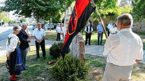 Pfarrer Gerhard Spöckl, der auch für Dekan Hanspeter Kern sprach, erinnerte an die Zeit der Vertreibung, als alle vor dem Nichts standen. Bei gesenkten Fahnen legte Lux eine Blumenschale am Gedenkstein ab.