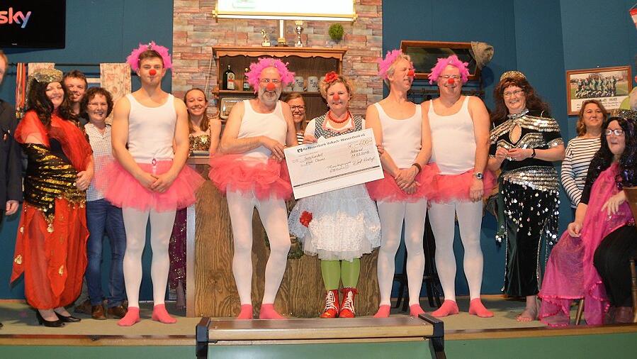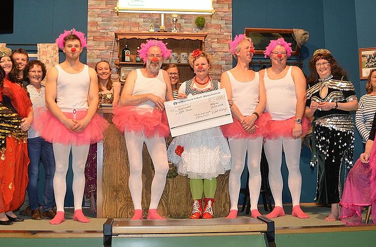 Das Stück „TSV Abtswind im Showfieber“, das die Theatergruppe der Feuerwehr Abtswind im Haus des Gastes auf die Bühne brachte, war ein voller Erfolg. Sebastian Kaiser, Vorsitzender des Feuerwehrvereins, konnte am Ende der letzten Vorstellung berichten: „Alle Aufführungen waren erstmals komplett ausverkauft.“ Die Akteure auf der Bühne sorgten für Lachtränen im Publikum. Und die „Lachtränen“ profitierten vom Erfolg, die Klinikclowns Lachtränen Würzburg nämlich, so die Mitteilung. Denn die Theatergruppe hatte pro verkaufter Eintrittskarte einen Euro für den Verein vorgesehen. Regisseurin Doris Senft-Balogh überreichte der Klinikclownin Schlawine (Tatjana Kapp), die Abtswinder Wurzeln hat, einen Scheck über 600 Euro und in der Spendenbox am Ausgang lagen nochmals 173 Euro. Schlawine hatte auch ein kleines Präsent für die Theaterspieler dabei: Für die Damen gab es ein kleines Herz und für die Herren eine rote Clownnase.