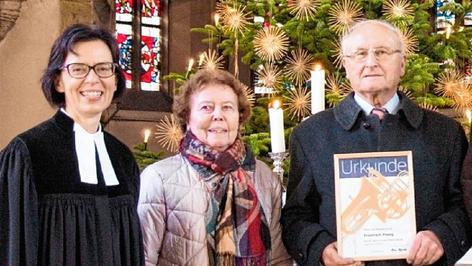 In einem Gottesdienst wurde Friedrich Preeg – zusammen mit seiner Frau Maria, die ihm in all den Jahren den Rücken für den Dienst im Posaunenchor freigehalten hat – offiziell verabschiedet. Als Anerkennung überreichte Pfarrerin Jacqueline Barraud-Volk einen Gutschein für ein Restaurant und einen Blumenstrauß für Frau Preeg. Friedrich Preeg bleibt auf Lebenszeit Ehrenmitglied des Posaunenchors.