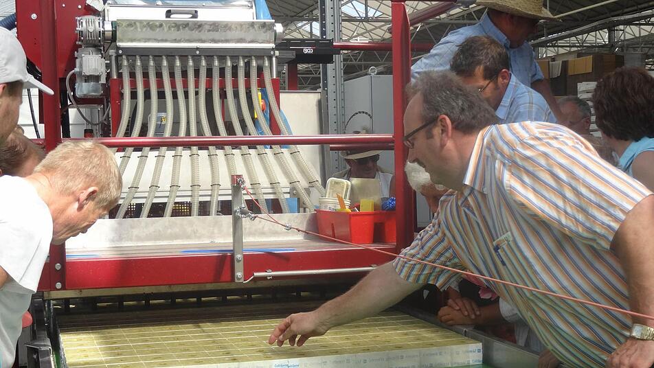 Die erste Gurkensämaschine und Stabsteckmaschine Albertshofens steht seit drei Wochen im Betrieb von "Jungpflanzen-Ger-nert". Wie mit Geisterhand werden die Steinwolltöpfe mit Wasser getränkt, die Gurkensamen werden automatisch in die vorgestanzten Löcher eingelegt, dann werden die Töpfe mit einem Stab versehen, damit die Gurken beim Wachsen Halt finden - und nach der Aufnahme der fertigen Töpfe auf eine Rückemaschine geht`s los in die vorgesehene Parzelle des Treibhauses zum Wachsen.