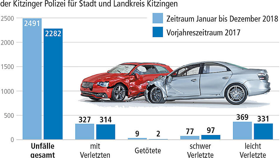 2491 Verkehrsunfälle registrierte die Polizei im Jahr 2018 auf den Straßen im Landkreis – 209 mehr als im Vorjahr. Bei acht tödlich verlaufenen Verkehrsunfällen waren neun Todesopfer zu beklagen; im Vorjahr waren es zwei Unfalltote. Die Anzahl der Verletzten lag bei 327 und war im Vergleich zum Vorjahr nahezu konstant. Die Zahl der Schwerverletzten sank von 97 auf 77, die der Leichtverletzten stieg von 331 auf 369. Die Kleinunfälle steigerten sich um rund 150 auf 1509. Die Steigerungen sieht man in der Kitzinger Polizeiinspektion als "klaren Handlungsauftrag", um verstärkt gegen die Unfallursachen vorzugehen.