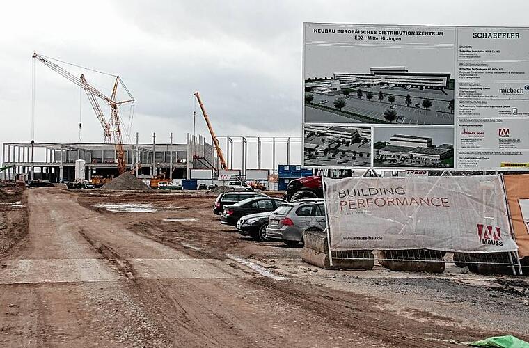Auf Kitzingens derzeit größter Baustelle sind die Arbeiten für das Warenverteilzentrum des Automobilzulieferers Schaeffler voll im Gange. Richtfest ist im Mai.