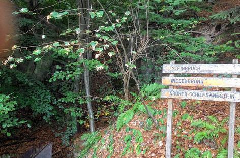 Wer ihn noch nicht kennt, wird auch vom Koboldsee überrascht sein. Idyllisch gelegen und gleich daneben der offizielle Grillplatz (Ausleihen der Grillroste gegen Kaution bei der Gemeinde). Es geht weiter und immer wieder an Bäumen mit auffällig vielen Misteln vorbei. Langsam zeigt sich, dass die 197 Höhenmeter nicht nur in der Karte stehen, sondern überwunden werden müssen. Alles nicht so schlimm, der Steinbruchweg führt durch einen abwechslungsreichen Wald. Auch eine Schutzhütte ist da, für eine kleine Pause. Die bietet sich am Steinbruch selbst an. Die Spuren des Abbaus von Grünem Schilfsandstein sind nicht zu übersehen.