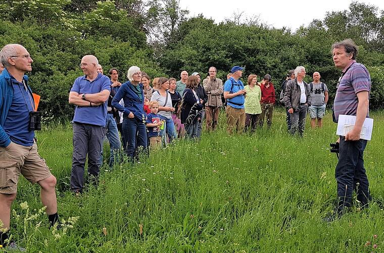 Gleich zu Anfang zeigte sich ein Turmfalke im Rüttelflug und eine Wiesenweihe im Tiefflug. Außerdem präsentierten sich Singdrossel, Feldlerche, Rotkehlchen, Mönchsgrasmücke und Neuntöter. Auch der Kuckuck rief immer wieder aus dem Wald. Um die Vögel besser beobachten zu können, wurden variantenreiche Ferngläser gezückt.