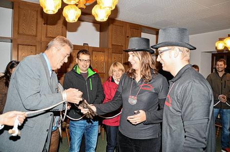 Vor lauter gute Laune im Rathaussaal hätten dann die Galgenvögel fast vergessen, die Schlüssel an sich zu nehmen. Doch Bürgermeister Dorsch will sie ja irgendwie loswerden, was mit gefesselten Händen sich zwar etwas schwierig gestaltet, aber dann doch irgendwie funktioniert. Frank Engelhardt und Bernd Hönnl unterhalten die stattliche Schar mit Liedern, unter anderem ob der unfreiwilligen Abdankung des Rates mit einem Potpourri von Abschiedsliedern. Heinz Dorsch, Galgenvögelsitzungsehrenpräsident, freut sich, dass es bei den Galgenvögeln mit Schwung und Elan weitergeht. „Toll, dass auch die Jugend dabei ist“, sagt Dorsch mit Blick auf die Kinder und die jungen Aktiven.