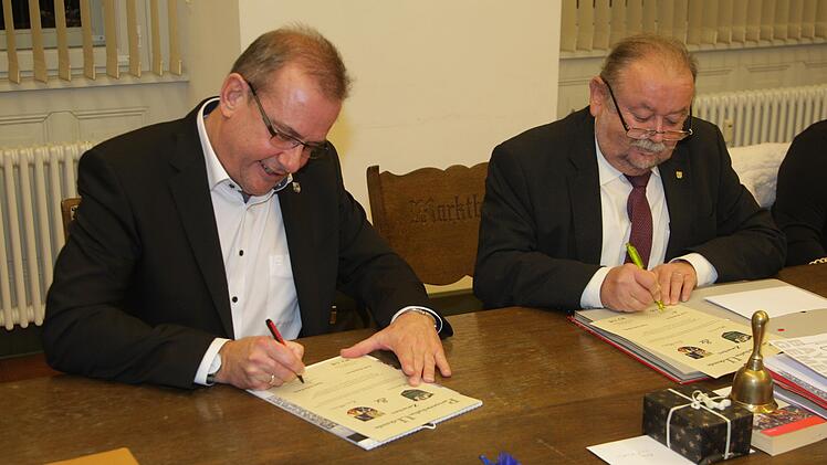 Teil der offiziellen Sitzung war die Unterzeichnung der Partnerschaftsurkunde mit dem thüringischen Zella-Mehlis. Schon vor einigen Monaten wurde eine erste Ausgabe der Urkunde in Zella-Mehlis von dem dortigen Bürgermeister Richard Rossel und Erich Hegwein unterzeichnet. Nun war der Gegenbesuch in Marktbreit, neben Rossel auch die beiden Beigeordneten Sarah Boost und Thomas Bischof.