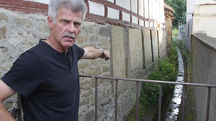 Die zweite Engstelle ist das Ende des Bachs mitten im Ort, wo das Wasser eigentlich in die Kanalisation abfließen sollte. Hier ist ein Gittertor als Kinderschutz angebracht. Wird das nicht rechtzeitig geöffnet, staut sich das Wasser und schießt dann ins Dorf. Beim Starkregen im vergangenen Jahr war der Wasserdruck auf dem durch Schwemmgut verstopften Gitter so stark, dass sogar die Bachmauern gelitten hatten. Hier könnte eine technische Lösung Abhilfe schaffen.