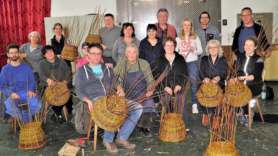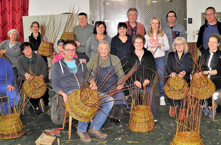 Die Weidenflechtkurse des Vereins für Orts-, Obst- und Gartenpflege Sommerach erfreuen sich großer Beliebtheit. So sind die zwei terminierten Lehrgänge alljährlich schon Wochen vor Kursbeginn längst ausgebucht. "Bei den vielen Anfragen", so Organisator Valentin Kestler (hintere Reihe Vierter von rechts), "müssen wir leider schon die eine oder andere Absage erteilen." Am vergangenen Wochenende trafen sich 14 Männer und Frauen aus Wiesenbronn, Unterpleichfeld, Sommerach und Nordheim, um in der Pfropfrebengenossenschaft in Sommerach erste Erfahrungen in punkto Weidenflechten zu sammeln. Zum Lehrgangs- Werkzeug gehörten neben dem Schnitzmesser eine Gartenschere, ein Fleischhaken sowie eine Schnur. Im Kurs flochten die Teilnehmer unter der Leitung des 88-jährigen Hans Schönberger (vorne, Zweiter von links) aus Wiesenbronn und dessen Assistenten Bernhard Weisensee (Sommerach, vorne links) einen Henkelkorb. Laut Mitteilung von Kestler waren die Teilnehmer mit großem Eifer bei der Sache. Als Erinnerung an den Lehrgang konnten die Teilnehmer nach Abschluss des Kurses den selbst geflochtenen Weidenhenkelkorb mit nach Hause nehmen. Wie erwähnt, der zweite in Kürze stattfindende Weidenflechtkurs ist längst ausgebucht. "Uns liegen bereits jetzt Anfragen für das nächste Jahr vor", berichtet Valentin Kestler und verweist auf eine baldmöglichste Anmeldung für das Jahr 2021.